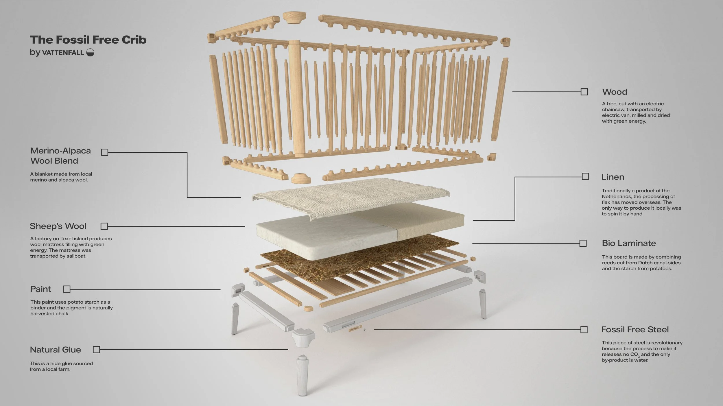 Context: This unusual baby crib was designed and developed by FROLIC studio for energy provider Vattenfall as a part of a campaign highlighting the end of the fossil-fuel era. The brief was to design and develop a baby crib without the use of fossil fuels, from sketch to final product. The main objective was to emphasize the use of fossil fuels in production.